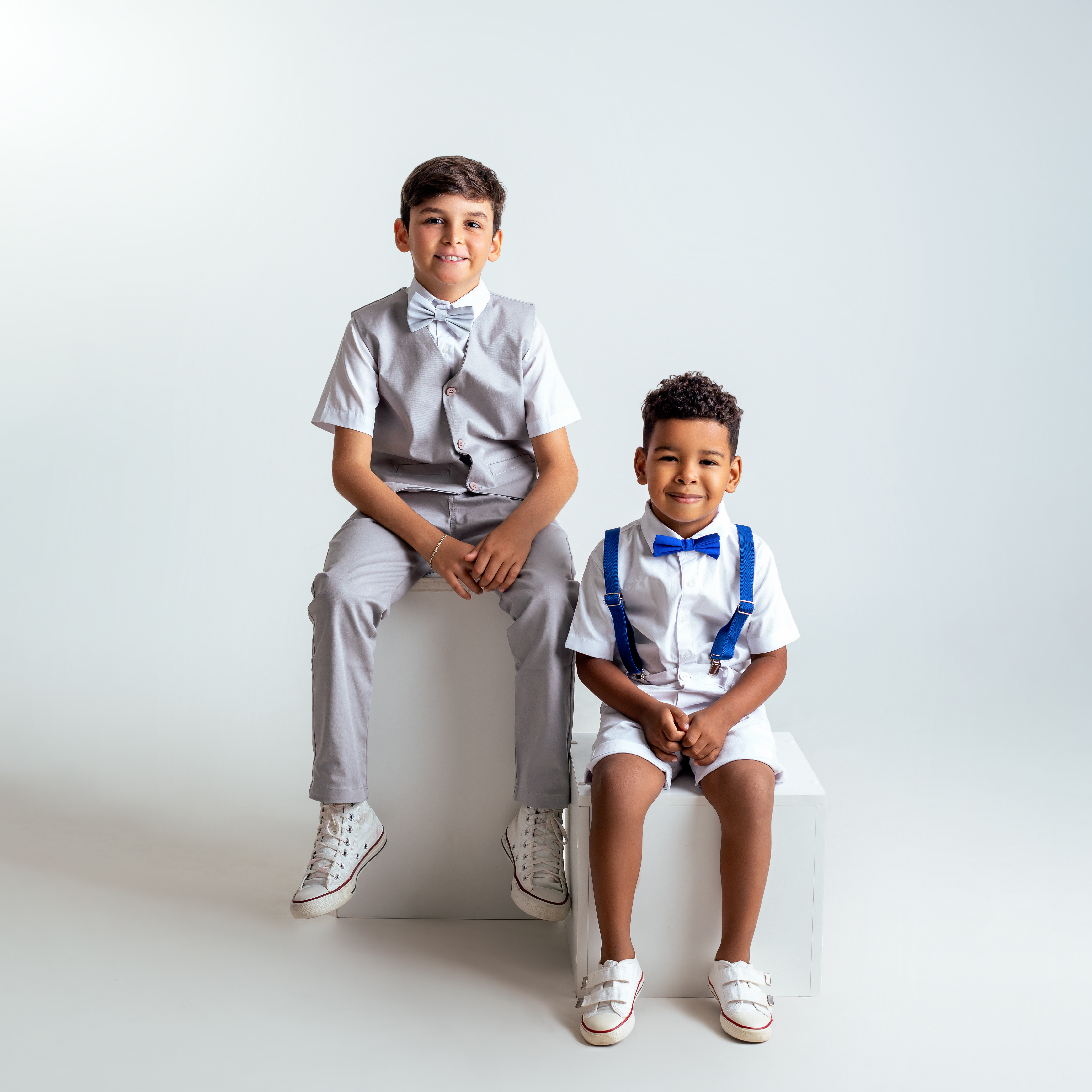 O Conjunto Social foi especialmente desenhado para tornar o momento do seu pequeno ainda mais especial. Composto por uma elegante bermuda de sarja branca, uma camisa de manga curta branca e uma gravata sofisticada, este conjunto é ideal para cerimônias e ocasiões formais.