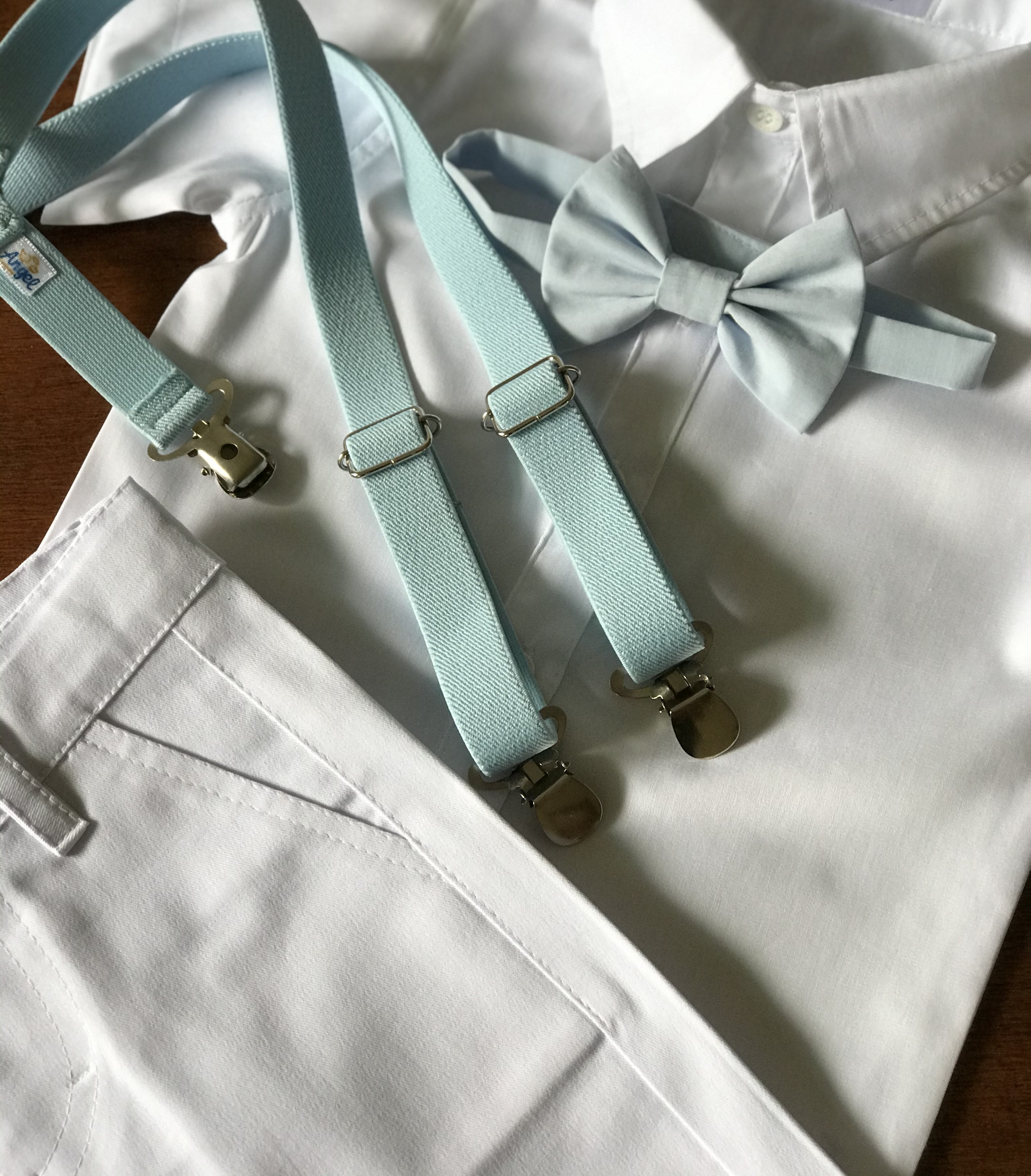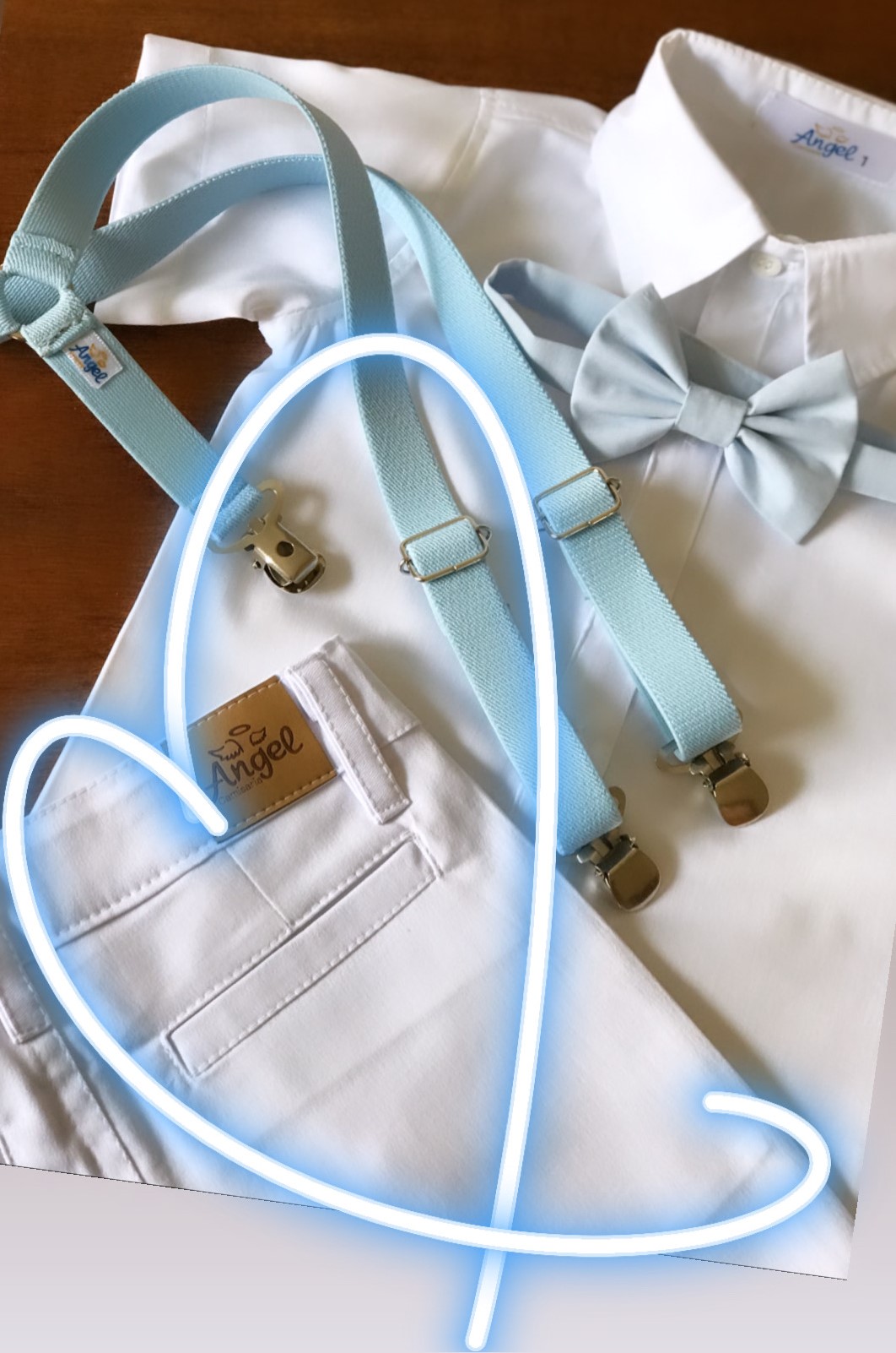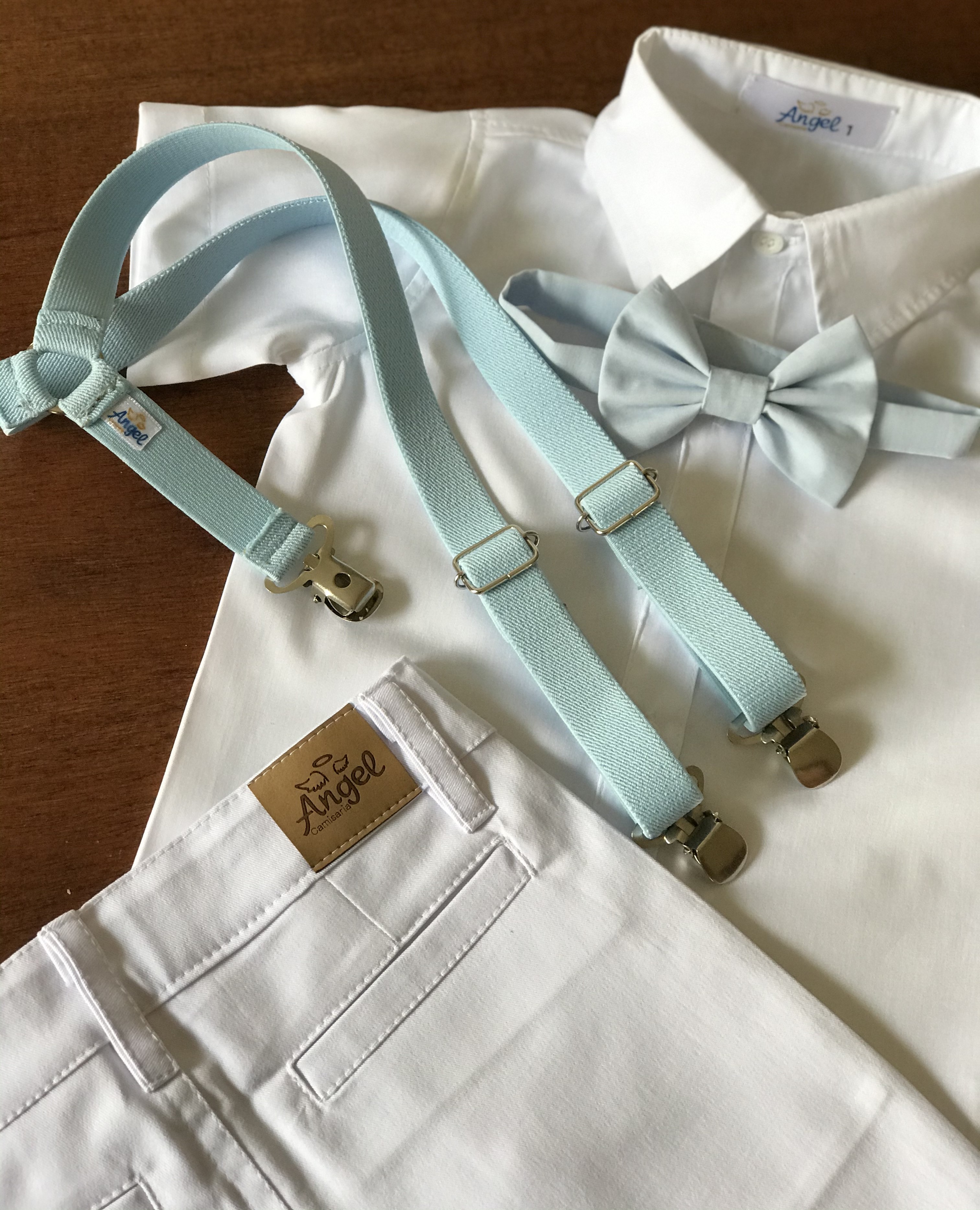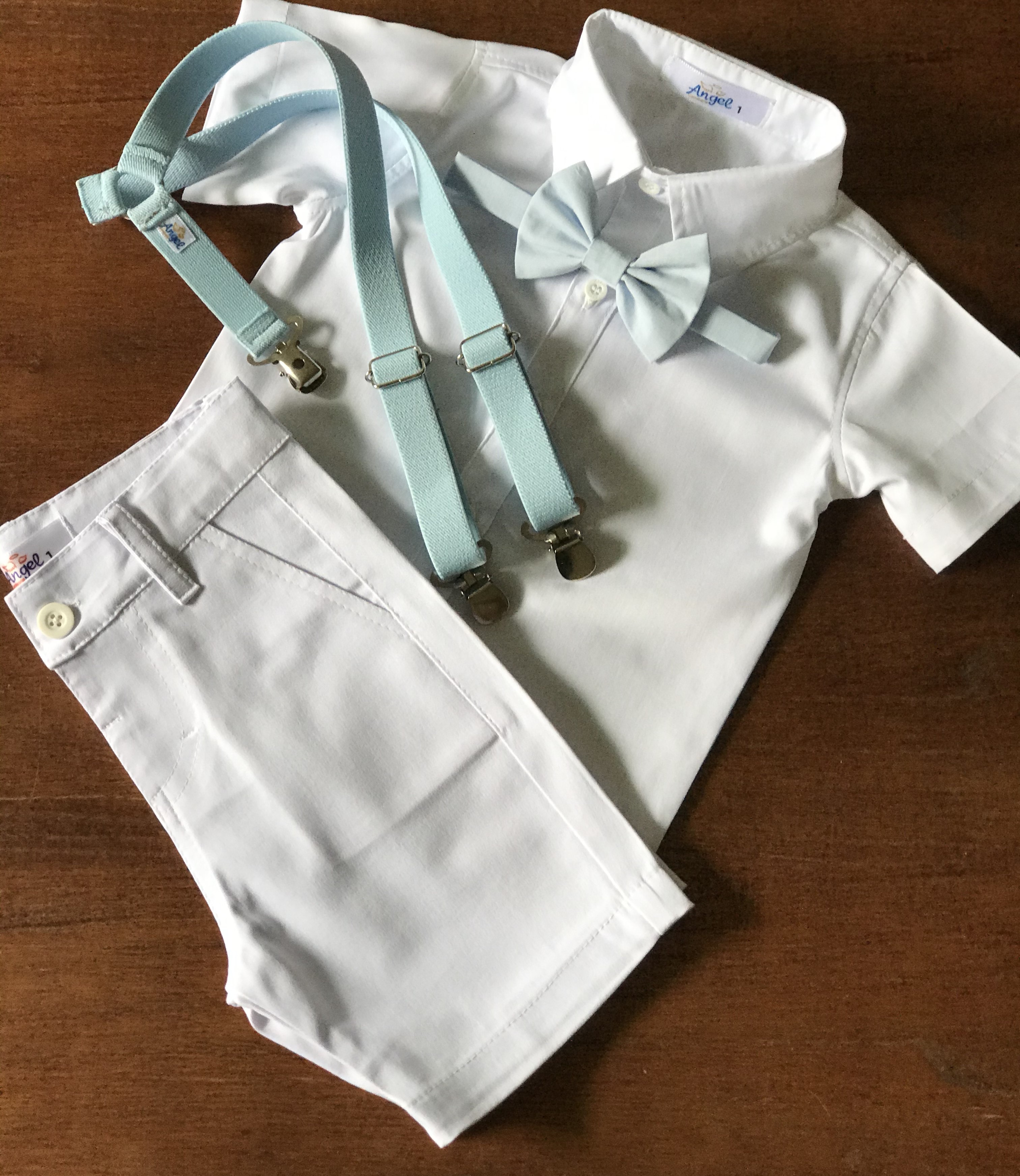 Conjunto Social Batizado (Camisa Manga Curta + Bermuda Branca + Gravata + Suspensório Azul Bebê)