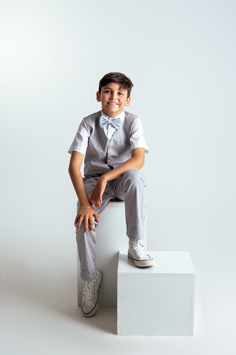 Conjunto Social (Camisa Manga Curta +Calça Cinza Prata + Colete +Gravata Cinza Prata)